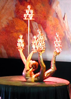 The Chinese acrobat show was incredible! Full of amazing stunts! I mean, people twisting their bodies in ways I didn't think was possible, jumping through hoops high in the air, and forming huge human pyramids while balancing on a seesaw. The grand finale was five men on motorcycles inside a sphere shaped cage all circling each other in all directions at very high speeds. We had to look away several times because we were convinced an ugly crash was coming.